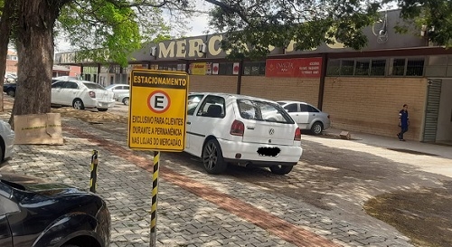 Ou "como estacionar na sombra"... Carro estacionado em frente a rampa de cadeirantes no Mercadão.