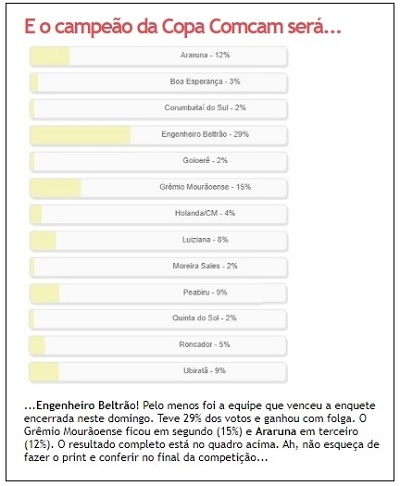 Engenheiro Beltrão conquistou no domingo o título de campeão da 3.a Copa Comcam ABL. Nenhuma surpresa para o leitor de Boca Santa. Enquete realizada no Site, no final de maio e início de junho, já apontou que os beltrãoenses ficariam com o caneco. O time teve 29% dos votos e faturou a enquete com folga. Bem mais folga que na decisão contra Luiziana, quando o título só foi garantido nos pênaltis...