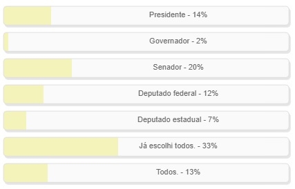 Enquete com esta pergunta teve votação encerrada neste domingo . Venceu a alternativa "Já escolhi todos", com 33% dos votos. Depois vieram "senador" (20%), "presidente" (14%) e "todos" (13%). "Governador" teve somente 2%, ou seja, para os internautas está mais fácil de ser escolhido. O resultado completo está no quadro acima.