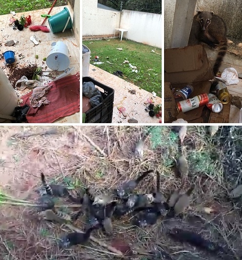 Moradores do jardim Parque das Acácias, em Campo Mourão, estão sofrendo com o "ataque" de quatis. Eles entram nos quintais e espalham lixo, derrubam vasos e materiais de limpeza, sujam jardins e varandas. Um morador filmou dezenas de quatis num terreno vizinho a sua casa.