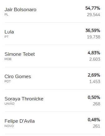 Simone Tebet fez 4,83% (2.603) e Ciro Gomes 2,69% (1.453).