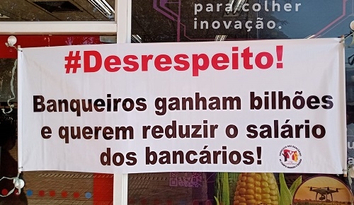 Faixa do Sindicato dos Bancários colocada nesta terça-feira em banco no centro de Campo Mourão. As agências bancárias da cidade ficaram com atendimento paralisado até às 11h.