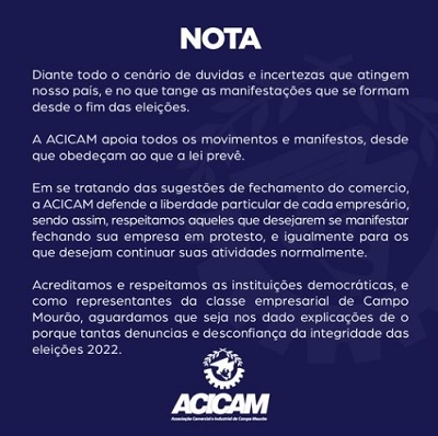 A Associação Comercial de Campo Mourão divulgou nota sobre a "greve geral" anunciada para esta segunda-feira.