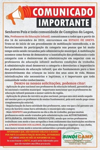 Um "comunicado" informa que, se não houver diálogo, uma paralisação pode ser iniciada ainda este mês.