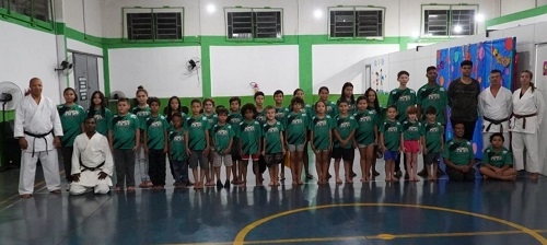 Associação Dojo entregou camisetas do Projeto Karatê Social para alunos do conjunto Fortunato Perdoncini, em Campo Mourão. O projeto atende 100 crianças e adolescentes e é mantido com recursos do governo do Estado, através da Secretária da Justiça, Família e Trabalho. As aulas são gratuitas e realizadas às segundas e quartas-feiras no barracão do Fortunato Perdoncini. Tião do Karatê é professor e coordenador do projeto.