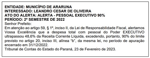 Segundo o Tribunal de Contas do Estado, o municípios encerrou o segundo semestre de 2022 compromentendo acima de 48,6% da receita corrente líquida com a folha de pagamento. Não estourou o limite de 54% da Lei de Responsabilidade Fiscal, mas já requer atenção, daí o motivo do alerta publicado pelo TC nesta terça-feira.