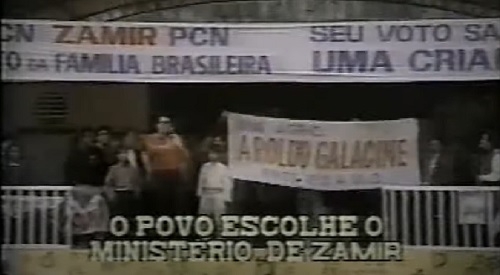 Ministros - No vídeo, cenas do comício que Zamir fez em São Paulo e anunciou que seus ministros seriam escolhidos pelo povo. Para a pasta da Agricultura citou o presidente da Coamo, José Aroldo Gallasssini, que na faixa mostrada ao público virou "Galacine"...