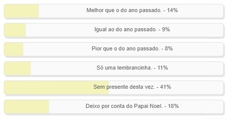 "Como será o presente de Natal deste ano". Enquete foi encerrada neste domingo. Resultado: 14% disseram que vai ser "melhor que o do ano passado"; 11% que vai ser "só uma lembrancinha" e 9% que será "igual ao do ano passado". Aí deu 34% dos votos e esses foram, digamos, os otimistas, já que a alternativa mais votada foi "Sem presentes desta vez", com 41%. O resultado completo está no quadro acima. Ah, esses pessimistas...
