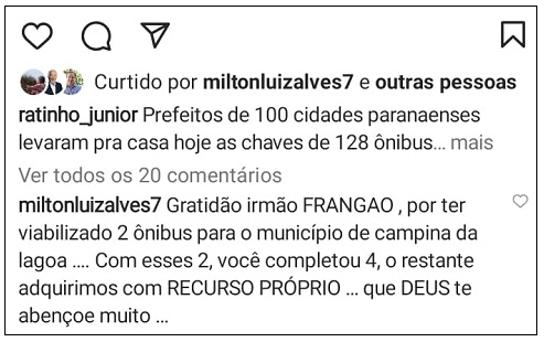 O governador Ratinho Jr postou nas redes sociais sobre a entrega, na segunda-feira, de 128 ônibus escolares para 100 prefeituras. O prefeito de Campina da Lagoa, Milton Luiz Alves, comentou na postagem. Agradeceu ao deputado federal Hermes Frangão por mais dois "busões" conseguidos nessa remessa. E completou: "O restante adquirimos com recurso próprio". Hummmm, foi uma indireta?...