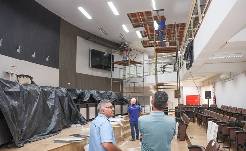 O prefeito Tauillo Tezelli que não invente de pedir alguma sessão extraordinária na Câmara de Campo Mourão antes do Natal. Olha como está o plenário. A "bagunça" toda é para a troca do forro da sala das sessões. Trata-se de uma das últimas etapas da reforma do prédio. O presidente Jadir Pepita, em últimos dias de comando, foi conferir os trabalhos.