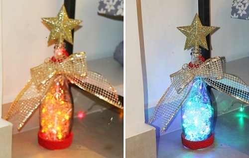 Loja do centro de Campo Mourão usa decoração natalina com luzes do Natal em garrafas de champanhe do ano novo. Criativo.