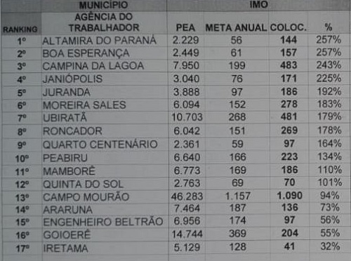 As agências do Trabalhador de Altamira do Paraná e Boa Esperança foram as que, proporcionalmente, mais conseguiram intermediar empregos na região em 2022. Ambas extrapolaram a meta em 257%. Em Altamira foram 144 colocações, sendo que a meta era 56. Em Boa Espernaça a meta era 61 empregos e as colocações somaram 157. Campina da Lagoa (243%) e Janiópolis (225%) também superaram a meta em mais de 200%.