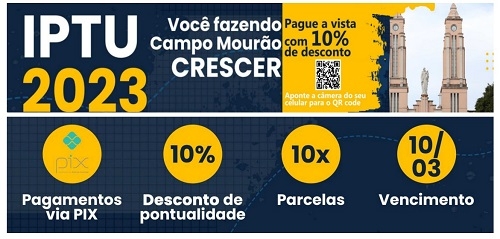 O IPTU 2023 de Campo Mourão só vai vencer no dia 10 de março, com direito a 10% de desconto para pagamento à vista. A distribuição do boleto, via Correios, começa na semana que vem. Quem quiser, no entanto, já pode ir pagando o imposto. Para isso, basta acessar o site da prefeitura. Dá pra pagar até por Pix. O aumentinho em relação ao ano passado é de 6,46% (variação do INPC).