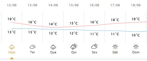 A chuva chegou e vai derrubar a temperatura em Campo Mourão. É o que prevê o Simepar. Até o próximo domingo, os termômetros chegarão no máximo a 19 graus. Na quarta-feira não passa de 14. No próximo domingo, a mínima vai a 10 graus. A chuva que começou nesta segunda-feira para na terça, mas volta quarta e quinta-feira. Palavra do Simepar.