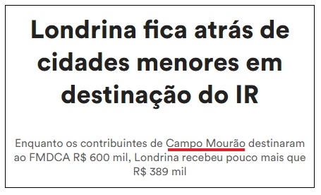 Matéria da Folha de Londrina desta sexta-feira destaca que Londrina fica para trás de cidades menores na arrecadação da Campanha do Imposto de Renda. Por "cidades menores" leia-se Campo Mourão. O jornal frisa que, enquanto Londrina fica em sexto lugar na arrecadação para o Fundo Municipal da Criança e do Adolescente e em quarto para o Fundo Municipal do Idoso, Campo Mourão aparece na segunda posição nos dois, só atrás de Curitiba.