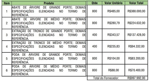 O contrato também prevê a extração de até 800 troncos e a poda de até 1,6 mil árvores.