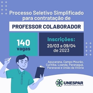 A Unespar abre inscrições, no próximo dia 20, para Processo Seletivo Simplificado com 140 vagas temporárias, em sete câmpus, para professores colaboradores. Em Campo Mourão são 17 vagas em oito cursos (veja abaixo). Os salários podem chegar a R$ 8,3 mil, dependendo da carga horária e do nível de graduação do professor.