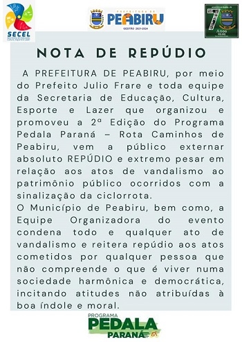 A prefeitura de Peabiru divulgou nota de repúdio sobre atos de vandalismo que aconteceram na sinalização do evento Pedala Paraná, que o município realizou no domingo. Na região da comunidade da Venda Branca, mudaram a direção da placa e parte dos ciclistas foi no caminho errado por vários quilômetros. Também houve placa que teve o adesivo retirado, deixando os participantes sem a informação necessária.