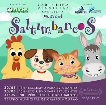 Lembra da Orquestra Carpe Diem, formada por estudantes de Campo Mourão e que estreou no ano passado? Marcou as primeiras apresentações de 2023 no Teatro Municipal. Será nos próximos dias 30 e 31, com o musical "Saltimbancos". No primeiro dia serão duas apresentações exclusivas para estudantes. No segundo, para o público em geral, a apresentação começa às 20h, com a entrada custando 1 kg de alimento (retirada de ingressos a partir das 18h30).