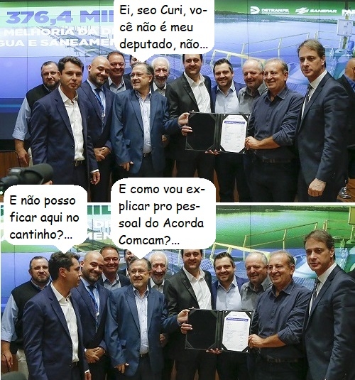 Os cliques são de Curitiba, nesta terça-feira, durante evento que a Sanepar anunciou investimentos em 12 municípios, sendo Campo Mourão um deles. O prefeito Tauillo Tezelli fez pose ao lado do governador Ratinho Jr e dos deputados Douglas Fabrício e Márcio Nunes, mas neste momento quem aparece ao lado dele é outro parlamentar - Alexandre Curi. Hummmmmm...
