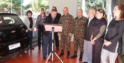 O tanque de guerra para ficar em exposição ainda não chegou, mas o Tiro de Guerra de Campo Mourão agora conta com um veículo. É um Agile 2011, que foi cedido pela prefeitura. Teve solenidade e tudo nesta quinta-feira. O carro era da Assistência Social e iria para leilão. Antes de ser repassado ao DER, passou por reforma.