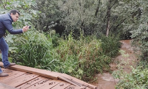 O que é que o prefeito Vivaldo Lessa, de Roncador, está fotografando sobre a ponte do rio Macaco? Calma, que tem explicação. Lessa e o prefeito de Mato Rico, Edelir Ribeiro, foram até a ponte, no limite dos dois municípios, para levandar dados visando a construção de uma nova ponte de concreto. A estrutura atual está precária e oferece riscos.