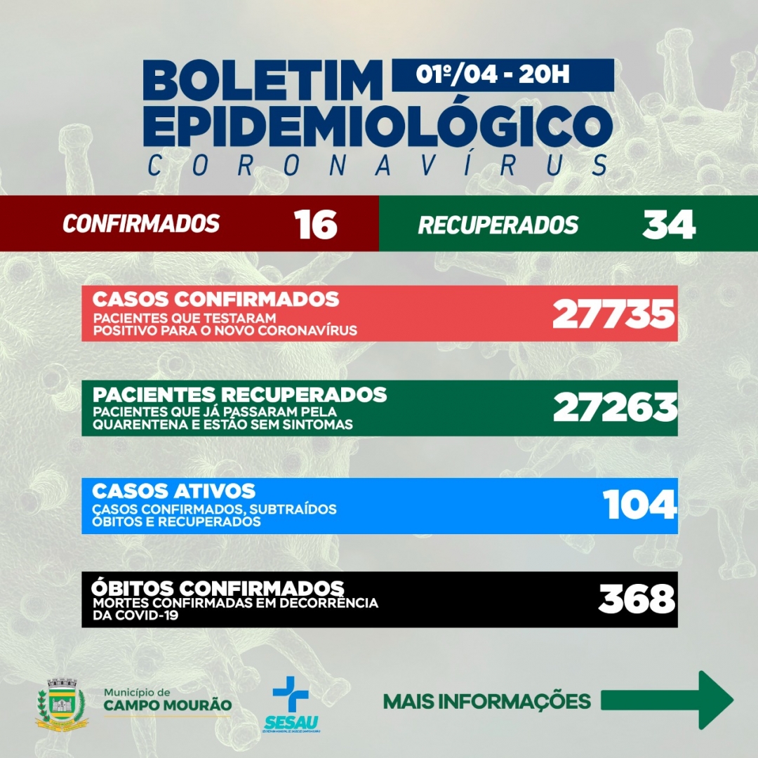 Dezesseis casos de covid-19 foram confirmados nesta sexta-feira em Campo Mourão. Os recuperados foram 34. Assim, o número de casos ativo caiu para 104. O que aumentou foram as internações. Há cinco pessoas internadas na enfermaria, todas de Campo Mourão, e duas na UTI, sendo uma delas de Engenheiro Beltrão.