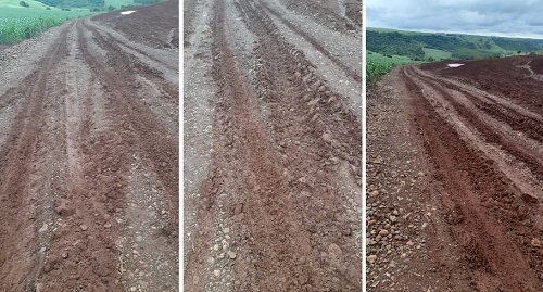 "Tiraram o cascalho do meio da estrada que vai pra comunidade do Saltinho, em Engenheiro Beltrão. Aí veio a chuva e virou o que você está vendo, um barro só. Nem tatu de chuteira sobe".