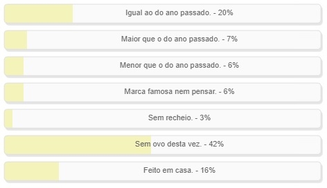"Como será o ovo de Páscoa deste ano?". Enquete com esta pergunta foi encerrada neste domingo. E olha só, venceu a alternativa "Sem ovo desta vez", com 42% dos votos. Já 20% disseram que era "igual ao do ano passado" e 16% "feito em casa". Apenas 7% foram na alternativa "maior que o do ano passado". O resultado completo está no quadro acima.