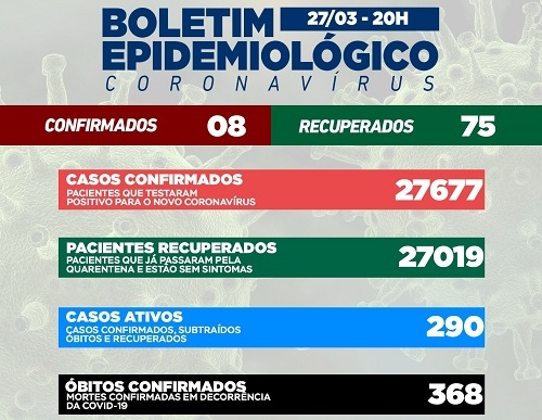 Oito casos de covid-19 foram confirmados neste domingo em Campo Mourão. Os recuperados foram 75, ou seja, quase 10 vezes mais. Resultado: boa redução no número de casos ativos, que ficou em 290. Na ala covid são três os pacientes internados - dois na enfermaria e um na UTI. Todos são moradores de Campo Mourão.