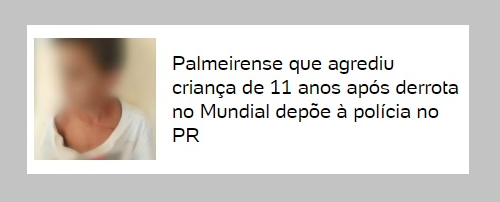 A história do menino de 11 anos, de Campo Mourão, que foi agredido após tirar sarro de torcedor do Palmeiras pela perda do Mundial de Clubes, virou notícia nacional. Saiu reportagem no portal UOL com direito a chamada na página inicial e tudo. A matéria destaca que o agressor já prestou depoimento à polícia. O assunto também rendeu reportagem no "1° Jornal", da Band.