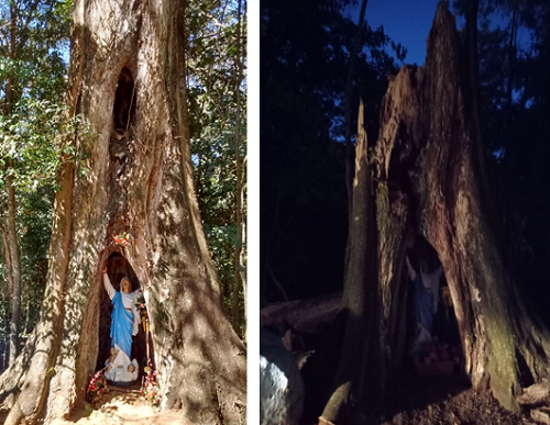 Detalhe: a árvore quebrou acima da imagem de Nossa Senhora de Assunção, que ficou intacta.