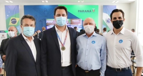 Na foto, o secretário de Estado Márcio Nunes, o governador Ratinho Jr e, da diretoria da Santa Casa, José Carlos Laurani e Pedro Baer.