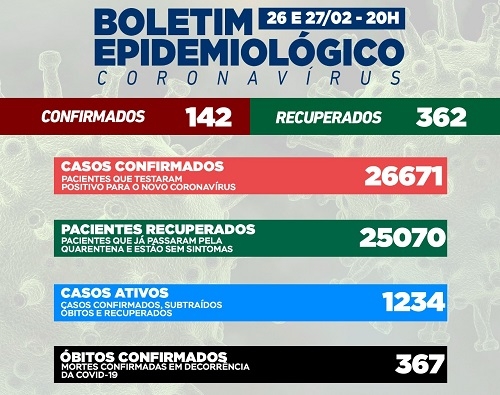 Campo Mourão registrou 142 novos casos de covid-19 entre sábado e domingo. Os recuperados foram mais que o dobro disso: 362. Resultado? Os casos ativos caíram para 1.234 no fim de semana. Na ala covid há oito pacientes internados - cinco na enfermaria (dois de Campo Mourão) e três na UTI (um mourãoense). A taxa de ocupação de leitos SUS está em 62% e 30%, respectivamente