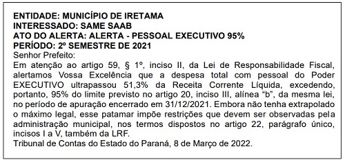 O município encerrou o segundo semestre do ano passado comprometendo acima de 51,3% da receita corrente líquida com a folha de pagamento. É o que diz publicação desta sexta-feira do Tribunal de Contas do Estado. O índice está abaixo do limite de Lei de Responsabilidade Fiscal (54%), mas já requer que medidas sejam adotadas.