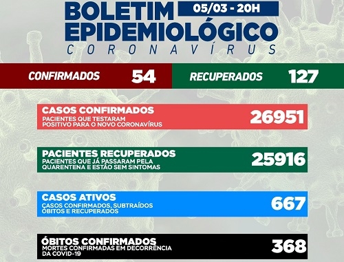 Casos ativos - O sábado teve mais 54 casos de covid confirmados em Campo Mourão. Os recuperados foram 127. O número de casos ativos caiu para 667.