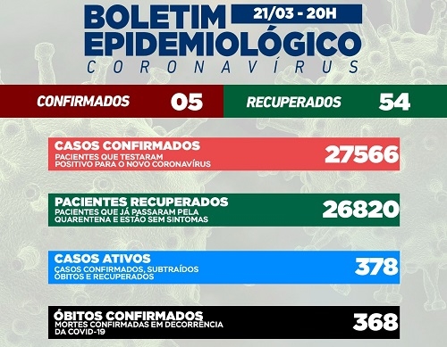 Apenas cinco casos de covid-19 foram confirmados nesta segunda-feira em Campo Mourão. Os recuperados foram 54. Assim, o número de casos ativos caiu para menos de 400 (378). Na ala covid não há ninguém internado na UTI. Na enfermaria são duas internações, ambas de pacientes de Luiziana.