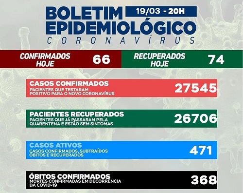 Mais 66 casos de covid-19 foram confirmados neste sábado em Campo Mourão. Os recuperados foram um pouco mais, 74. Assim, o número de casos ativos teve pequena queda e fechou o dia em 471. Ba ala covid há três pacientes internados - dois de Luiziana na enfermaria e um de Terra Boa na UTI.