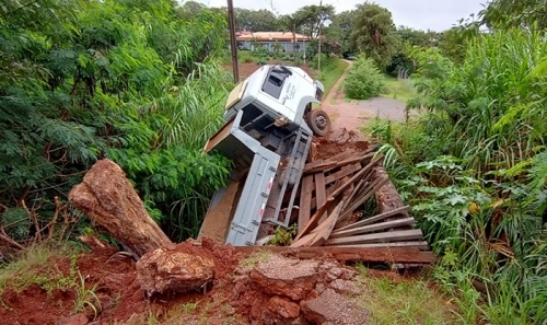Um caminhão carregado de areia caiu da ponte sobre o ribeirão Mamborê, neste sábado, no perímetro urbano de Mamborê. A ponte desabou. Motorista e acompanhante nada sofreram além do susto. A carga se areia se perdeu.