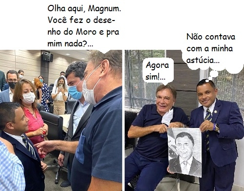 Ao se encontrar, semana passada, em Maringá, com o pré-presidenciável Sérgio Moro, o "recepcionista oficial" de Campo Mourão, Magnum Alves, não foi de mãos vazias, não. Levou o desenho que fez do senador Alvaro Dias, que também estava presente. Moro já tinha recebido um desenho desses em outra oportunidade.