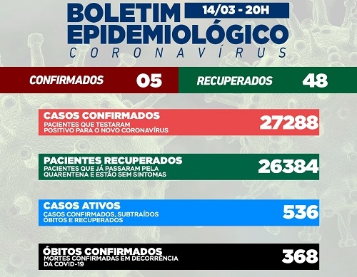 Apenas cinco novos casos de covid-19 foram confirmados nesta segunda-feira em Campo Mourão. No domingo tinham sido nove. Os pacientes recuperados foram 48. Assim, o número de casos ativos caiu para 536. Na ala covid, a enfermaria continua "zerada". Na UTI as internações subiram de três para quatro e um paciente é de Campo Mourão. A taxa de ocupação de leitos do SUS é de 40%.