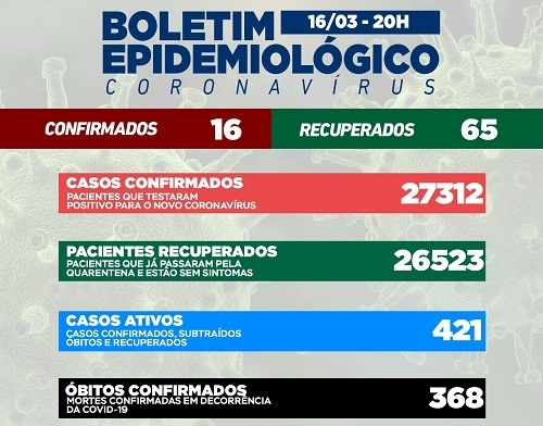 Dezesseis casos de covid-19 foram confirmados em Campo Mourão nesta quarta-feira. Os recuperados foram 65. Resultado: o número de casos ativos caiu para 421. Na ala covid há um paciente de Campo Mourão internado na enfermaria. Na UTI há duas internações - uma de Luiziana e outra de Terra Boa.