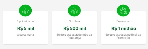 São 200 sorteios de R$ 5 mil, um de R$ 500 mil em outubro e outro de R$ 1 milhão no encerramento da promoção.