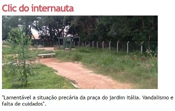 Sobre o internauta que reclamou da situação da praça do jardim Itália, a prefeitura de Campo Mourão informa que a loteadora não entregou a praça ainda e, assim, a responsabilidade de manutenção é dela. Se trata de um projeto não concluído. O município vai notificar a empresa.