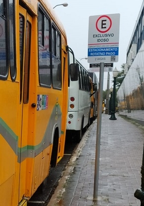 A rua Francisco Albuquerque virou estacionamento de ônibus, mas as placas de vagas para idosos e deficientes continuam lá...