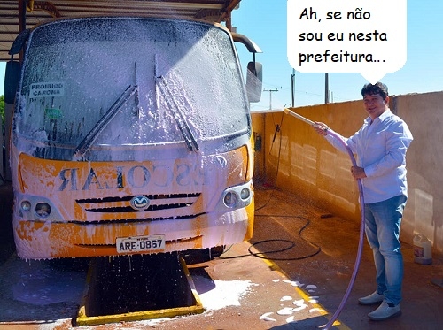 O clic é de Farol e, sim, é o prefeito Oclécio Meneses que aparece lavando o ônibus escolar. Mas calma. Foi só uma pose que marcou a inauguração do lavador de veículos da frota municipal. "Com recirculação e tratamento de 100% do efluente, devidamente licenciado pelo órgão ambiental competente", explicou Meneses.