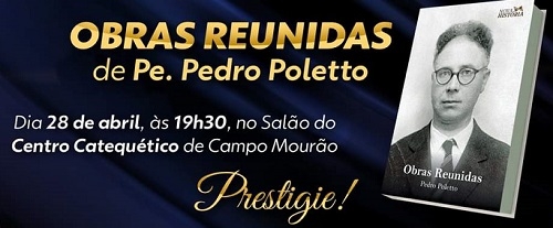 Acontece na próxima quinta-feira (19h30), no Centro Catequético de Campo Mourão, o lançamento do livro "Obras Reunidas". O autor é o padre Pedro Poletto, que morreu em 1975, aos 63 anos. São três livros deles que foram reunidos numa obra só. "Mãe", "Condensado sobre o amor" e "Rumo à Língua Avó" foram escritos na década de 1970, quando o padre atuava na diocese de Campo Mourão. Ele é o patrono da cadeira número 13 da AML.