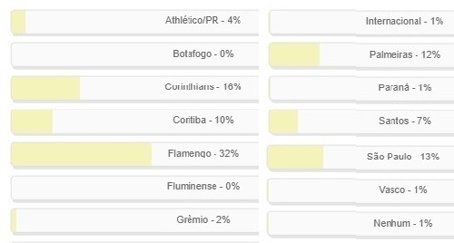 "Qual time tem mais torcida em Campo Mourão e região?" Enquete com esta pergunta foi encerrada neste domingo. O Flamengo ganhou com folga. Teve 32% dos votos, o dobro do Corinthians, que ficou em segundo, com 16%. Depois vieram São Paulo (13%), Palmeiras (12%) e, surpresa, Coritiba (10%). O resultado completo está no quadro acimca. E lembre-se: é só uma enquete...