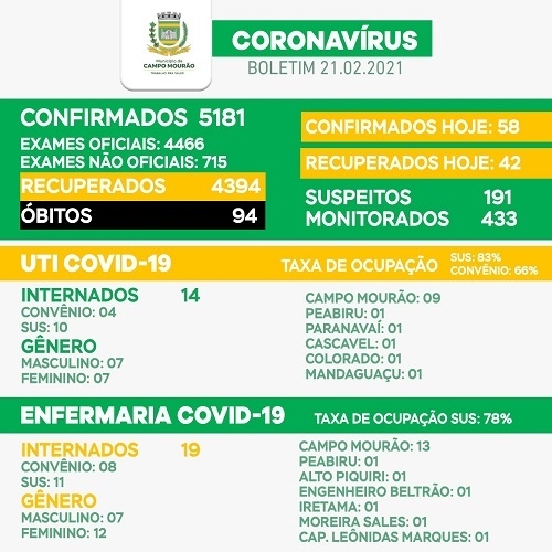 Boletim Covid desde domingo trouxe a confirmação de mais 58 casos em Campo Mourão. Bem acima da média do mês (28,6). O número de suspeitos caiu para 191. Em compensação o índice de ocupação na UTI subiu de 66% para 83%. Ao todo, 33 pessos estão internadas na ala covid, sendo 14 na unidade de terapia intensiva.