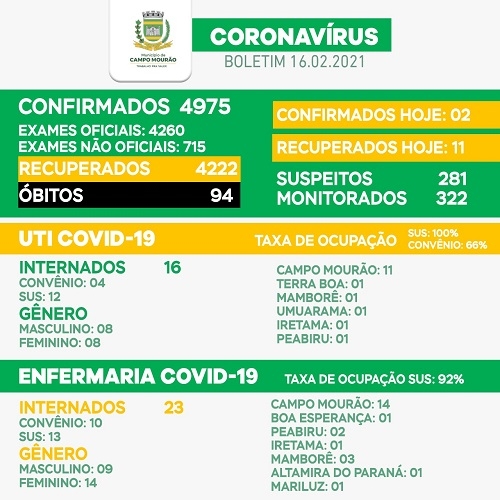Apenas dois casos de covid-19 foram confirmados nesta terça-feira em Campo Mourão. Desde o feriado de 7 setembro, quando o boletim ficou zerado, não eram tão poucos. Mas o número de mourãoenses com o vírus ativo ainda é alto: 659. Na ala covid da Santa Casa, a UTI voltou a ter todos os leitos do SUS ocupados. Na enfermaria a ocupação é de 92%.
